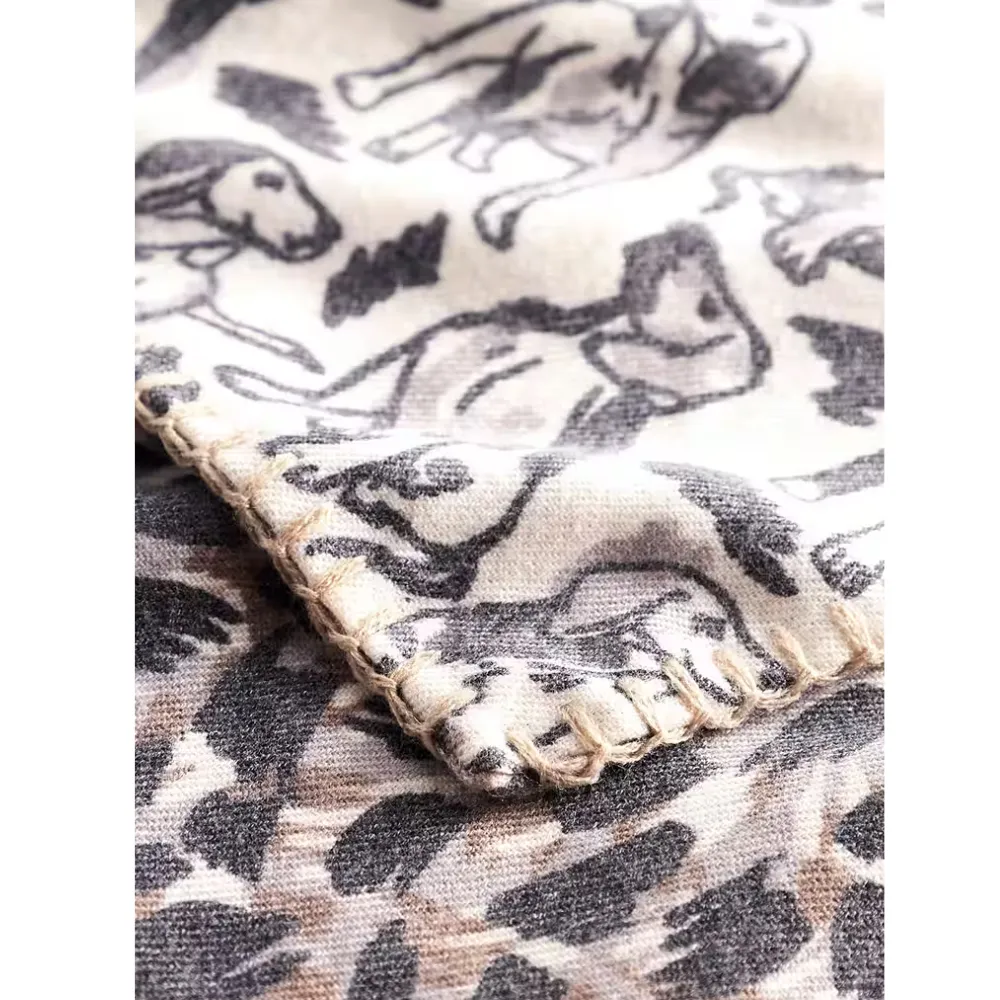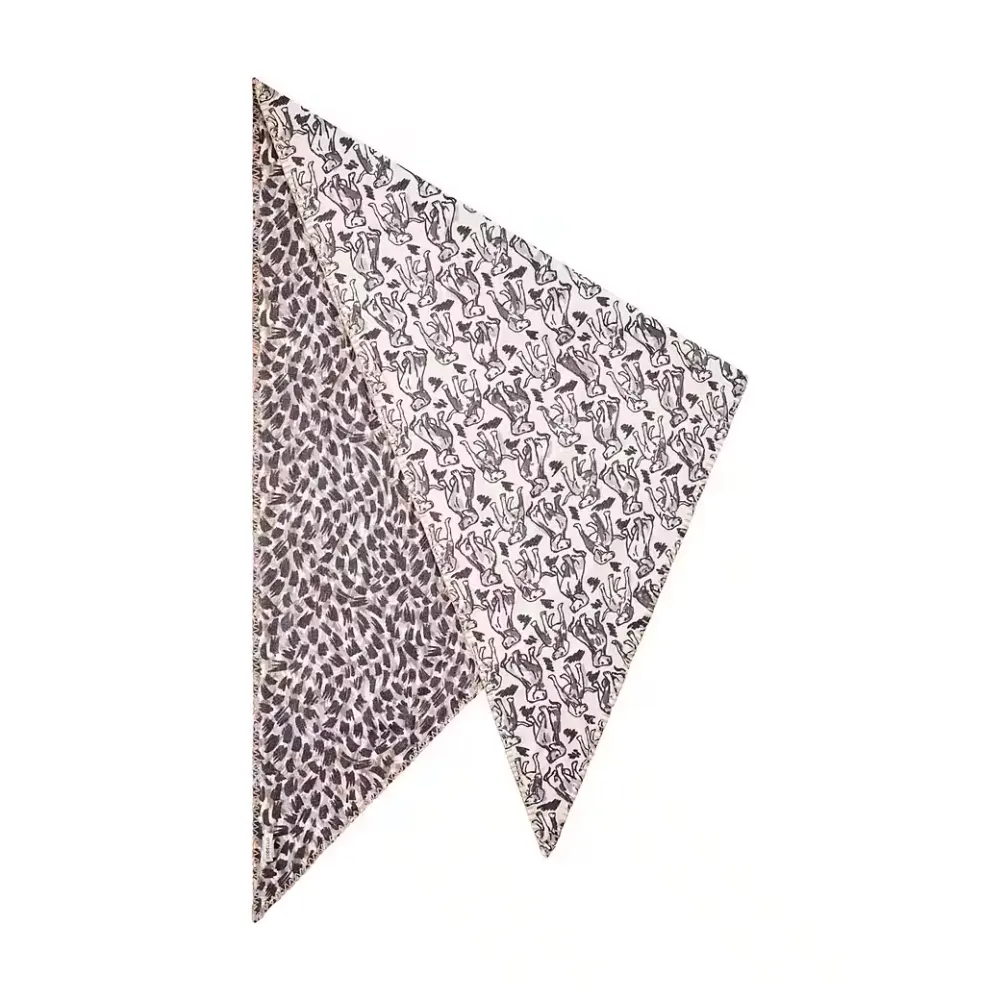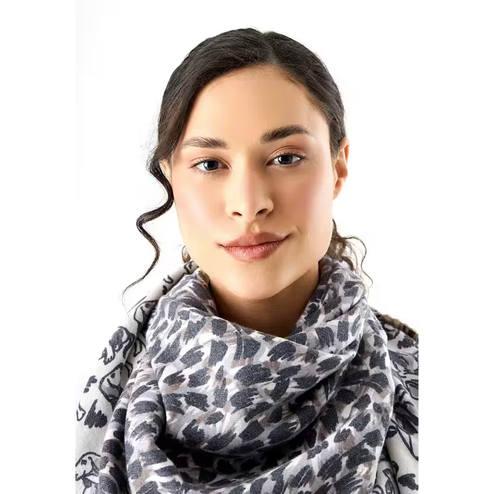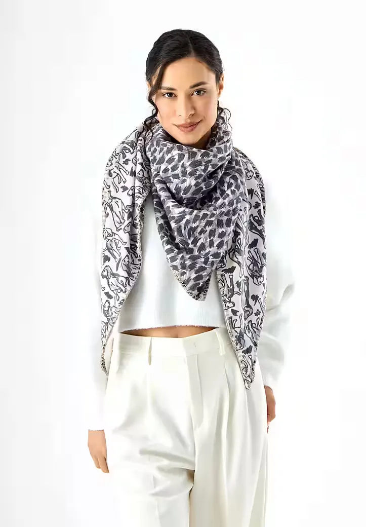 Eyecatcher für jeden Tag: Dieses kaschmirweiche Dreieckstuch in Beigetönen begeistert mit einem außergewöhnlichen Mix aus Leomuster und verspielten Hundemotiven. Die angenehm weiche Materialmischung schmiegt sich sanft an und wärmt im Winter.